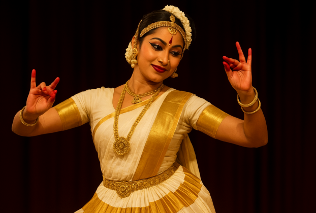Mohiniyattam is a classical dance form of Kerala known for its graceful, feminine movements and expressive storytelling. Rooted in temple traditions, it combines gentle swaying steps, subtle facial expressions, and devotional themes, often depicting stories from Hindu mythology. With its white-and-gold attire, soulful music, and emphasis on elegance, Mohiniyattam embodies Kerala’s cultural beauty and spiritual heritage.